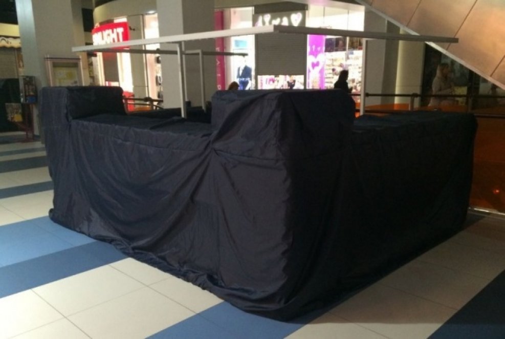 Чехол на торговый островок Д1500хШ1000хВ1000 мм изготавливается в виде прямоугольного параллелепипеда. Крепление чехла по низу возможно шнуром. Может быть установлена молния для удобного снятия и одевания чехла.