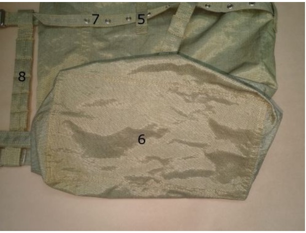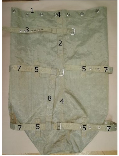 Ремень затяжной боковой – 2 шт., один продевается через верхние шлевки, второй через нижние, длина 1340 мм, ширина 30 мм, сшит из одной полоски ткани, сложенной вдвое. На расстоянии 200 мм от язычка расположено 15 стальных люверсов Ø 5-6 мм с интервалом между собой 45 мм. Язычок косой с двойной прошивкой. На ремне установлена роликовая пряжка, изготовленная из проволоки толщиной 4 мм, внутренняя часть пряжки имеет размер 25х25 мм