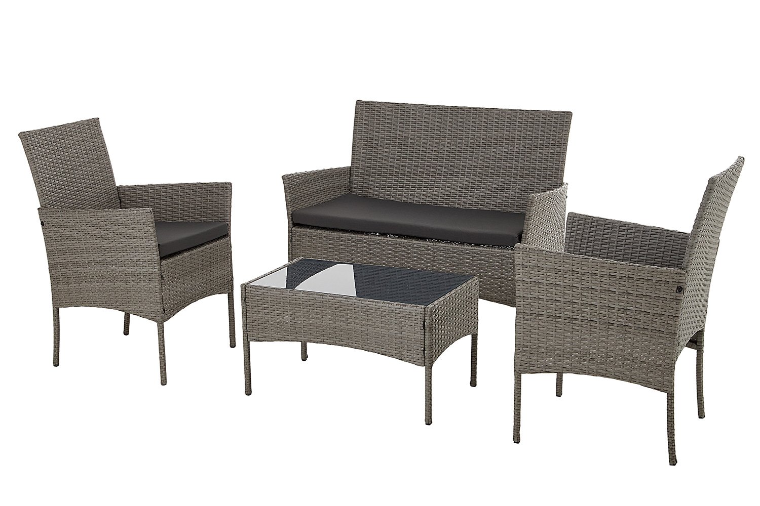 Набор садовой мебели Rio состоит из двух одноместных кресел, журнального столика и дивана (трехместного кресла). Внешний вид готового изделия: все части набора выполнены из стального каркаса, а переплетения, образующие подлокотники, спинки и боковые стороны выполнены плотным переплетением из искусственного ротанга коричне-серового цвета. Преимущества такого материала заключается в том, что он не плесневеет под воздействием воды, не размокает, не рушится и не выцветает на солнечном свете. На готовых изделиях уложены матрасы, с максимальной нагрузкой 120 кг, а на столе рабочей поверхностью является закаленное стекло, которое может выдерживать до 25 кг нагрузки.