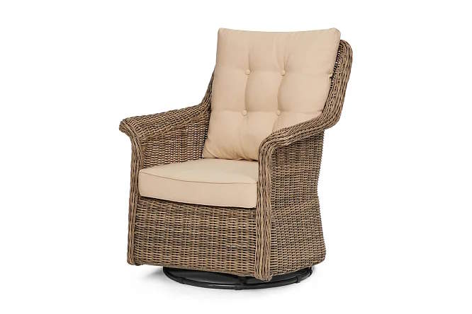 Каждая дача нуждается в креслах на летний период и кресло Монтреаль – одно из них. Вращающееся кресло Монтреаль является универсальной и высоко-комфортабельной мебелью. Кресло имеет не вызывающий внешний вид – мягкие изгибы подлокотников и спинки, спинка удлиненная. Само кресло состоит из легкого алюминиевого каркаса (такое кресло имеет небольшой вес и может быть переставлено в любое место, что очень важно, когда человек выбирает место с солнцем или без), оплетенного искусственным ротангом. Искусственный ротанг придает креслу вид, будто оно сделано из натурального дерева, однако этот материал куда прочнее, и не поддается влиянию солнца, ветра и осадков.