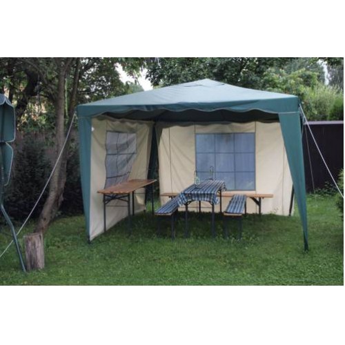 Тент-крыша для шатра беседки выполнена из Оксфорда 240D. Поверхность износостойкого материала пропитана специальным водоотталкивающим составом. Благодаря специальной пропитке полотно выдерживает высокую механическую нагрузку до 2000 мл водяного столба.