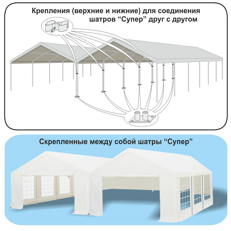 Водослив надежно устанавливается между стенками функционального шатра серии «Супер». Монтаж выполняется по стыку крыш с помощью троса, который поставляется в комплекте. Его пропускают через металлические люверсы, расположенные по периметру полотна.