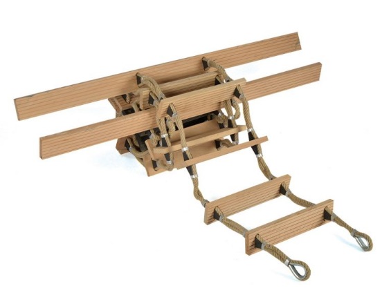 Чехол для штормтрапа выполнен из ПВХ ткани. Поверхность материала пропитана специальным водоотталкивающим составом. По периметру защитного полотна установлены металлические люверсы, через которые пропускается трос для надежной фиксации веревочной лестницы на палубе.
